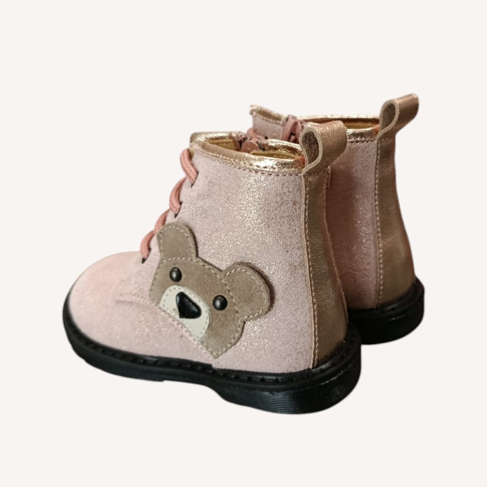Anfibio artigianale in pelle rosa effetto glitter orsetto laterale.