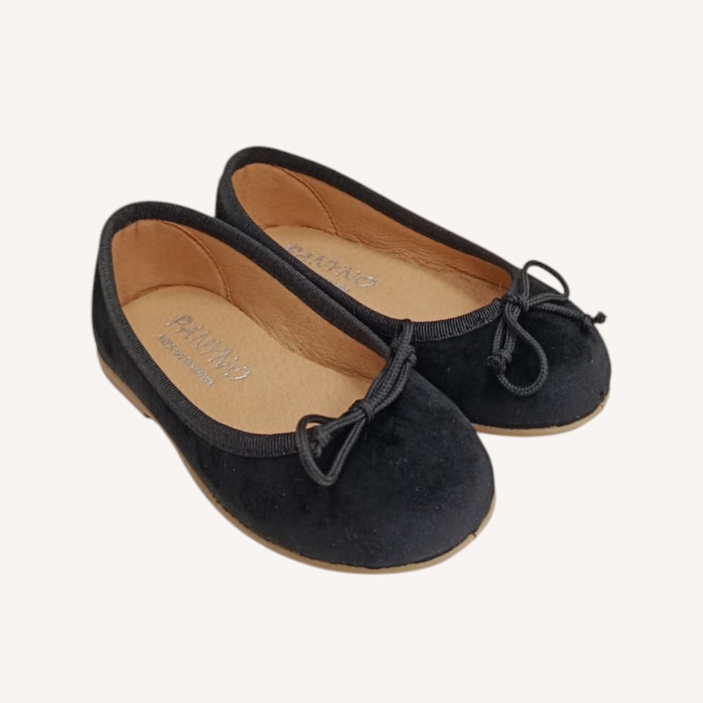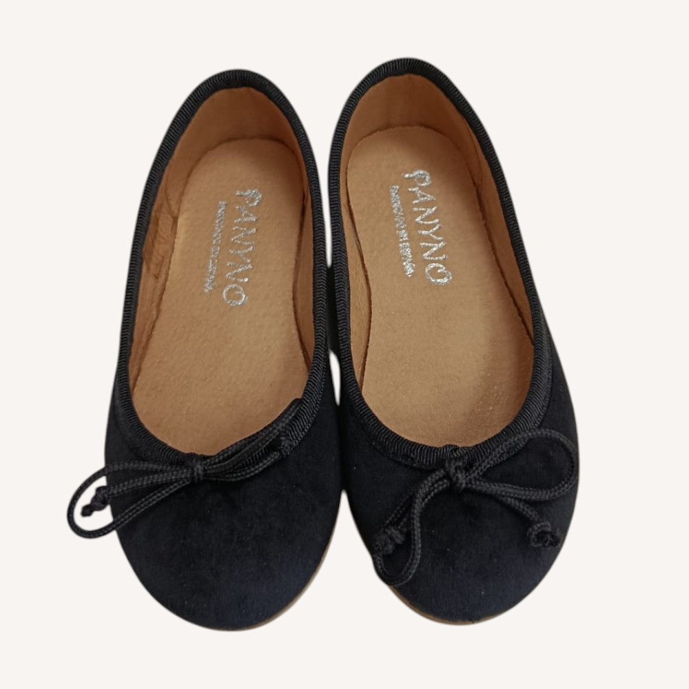 Ballerina nera in camoscio con bordature e fiocchetto.