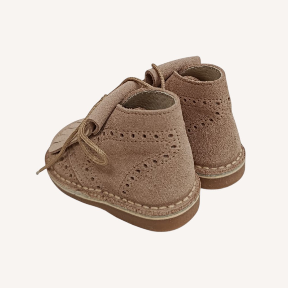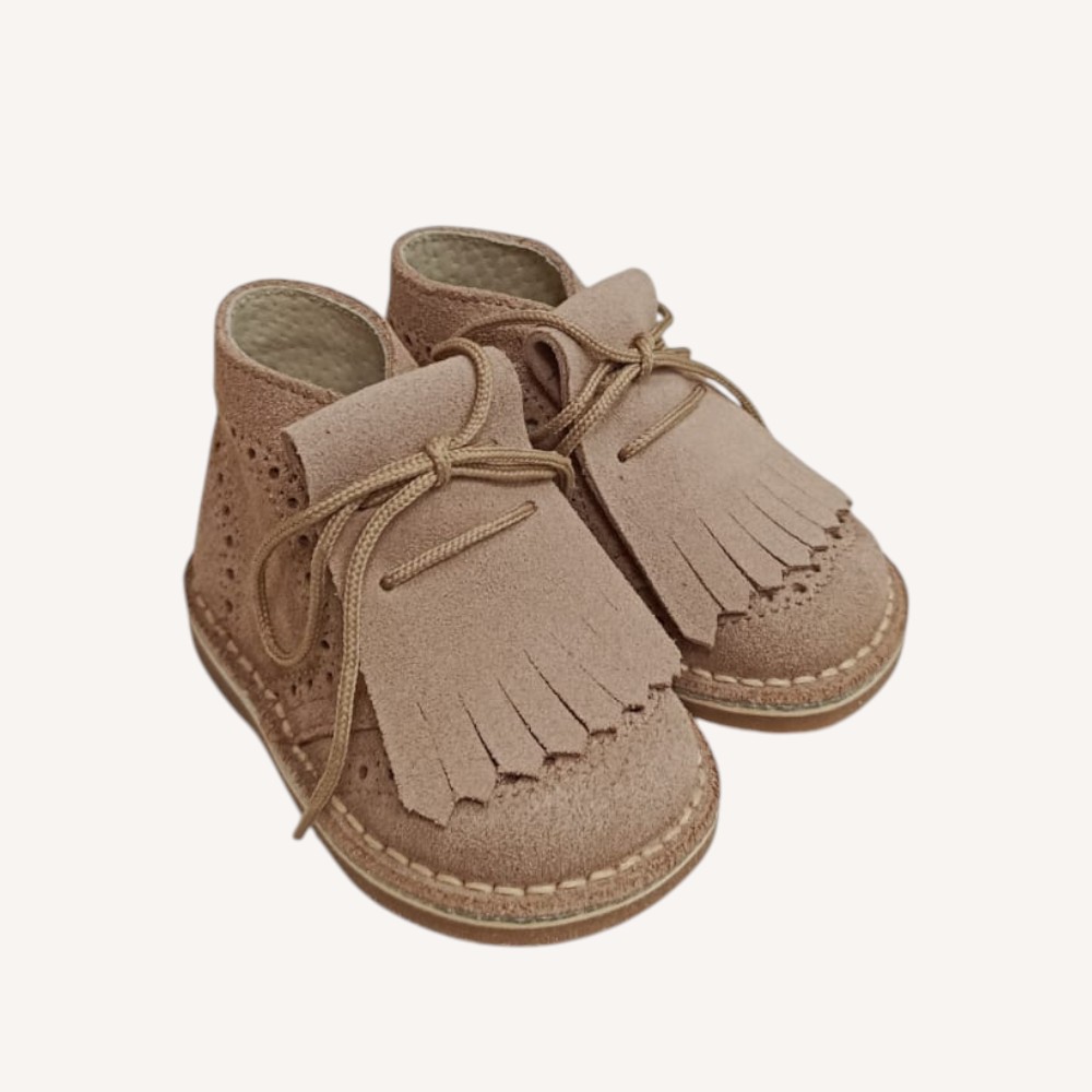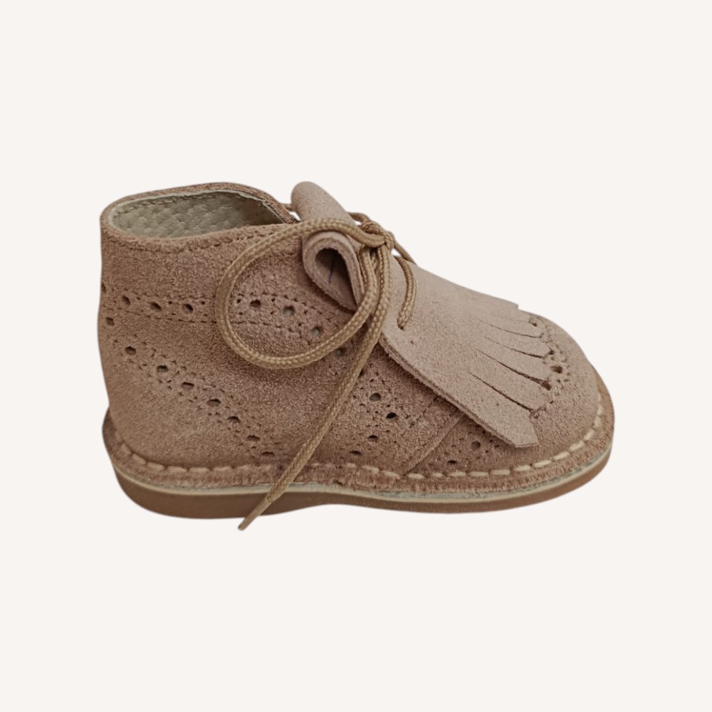 Scarpina in camoscio cammello modello francesina con frange removibili e lacci.
