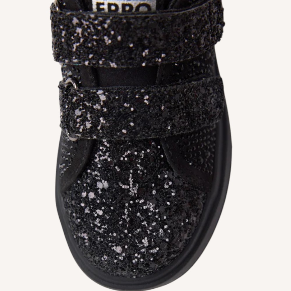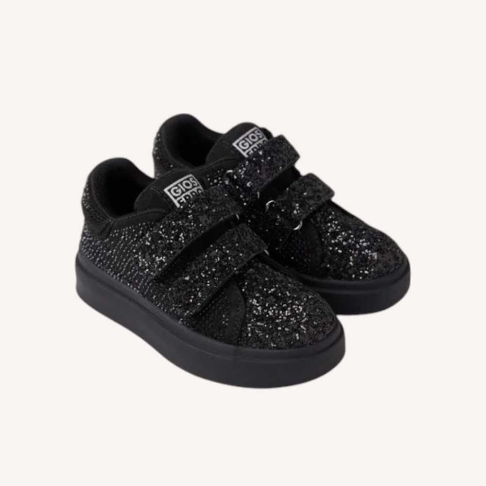 Sneakers impreziosite da strass. Presentano una doppia chiusura regolabile sul collo del piede nei numeri più piccoli mentre nelle calzate più grandi presentano lacci; hanno una soletta imbottita. Tomaia in glitter e poliestere. Fodera e soletta in poliestere traspirante. Suola flessibile in TPR.