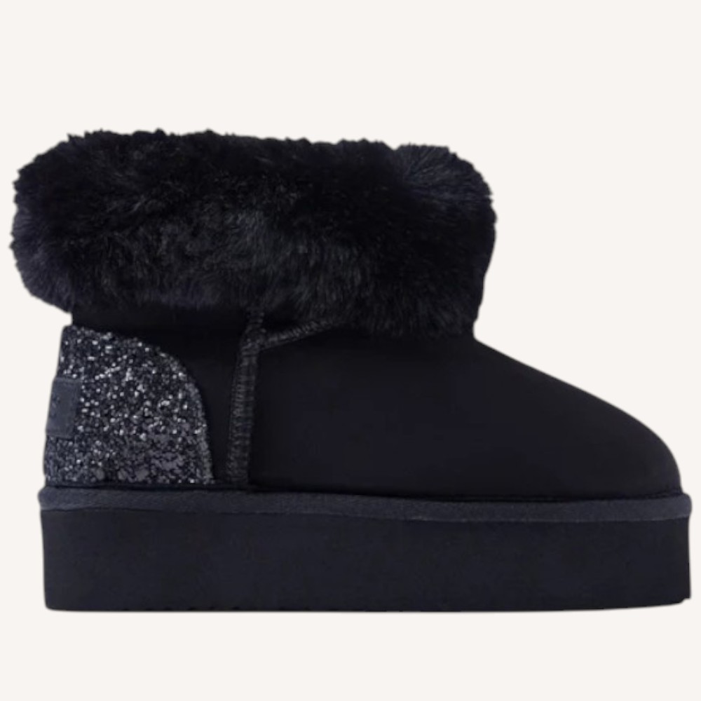 Stivali australiani glitterati con collo in pelliccia. Proteggono dagli schizzi d’acqua e dall’umidità. Hanno una soletta imbottita e fodera in pelliccia. Tomaia in microfibra e glitter. Fodera e soletta in pelliccia sintetica. Suola flessibile in TPR.